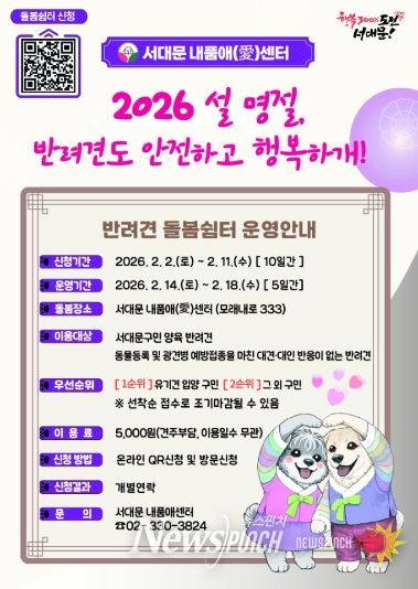 뉴스펀치 박상훈 기자 | 서대문구가 설 연휴 기간 반려견 돌봄에 어려움이 있는 구민들을 위해 이달 14일 토요일부터 18일 수요일까지 닷새간 서대문 내품애(愛)센터(모래내로 333)에서 반려견 돌봄 쉼터를 운영한다.