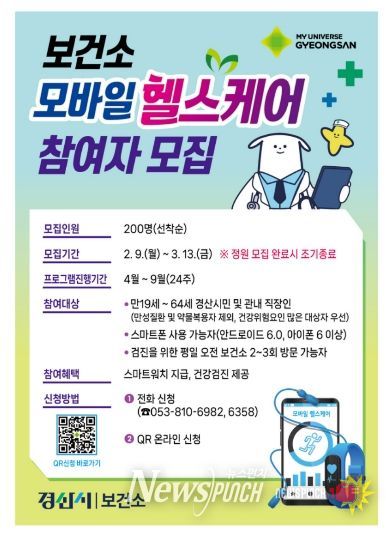 뉴스펀치 박세훈 기자 | 경산시는 ICT 기술을 활용해 시민의 생활 습관을 개선하는‘2026년 모바일 헬스케어 사업’ 참여자 200명을 오는 9일부터 모집한다고 밝혔다.