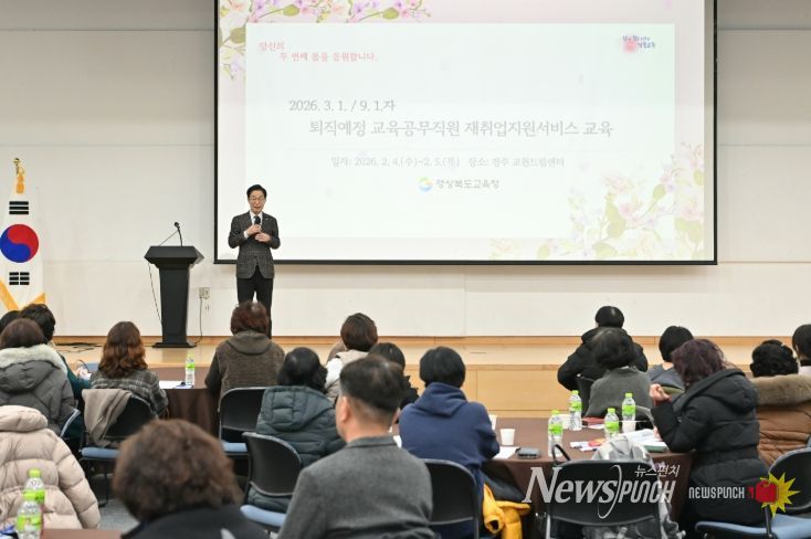 뉴스펀치 박세훈 기자 | 경북교육청은 4일부터 5일까지 1박 2일간 경주 교원드림센터에서 2026년 3월 1일과 9월 1일 퇴직 예정인 교육공무직원 213명을 대상으로 재취업지원서비스 진로설계교육을 실시했다고 밝혔다.