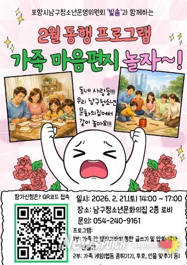 뉴스펀치 박세훈 기자 | 포항시청소년재단 남구청소년문화의집은 오는 21일 토요일 청소년 및 남구 지역 주민들을 위한 동행 2월 프로그램 ‘가족 마음 편지 놀자’를 진행하고 참가자를 모집한다.