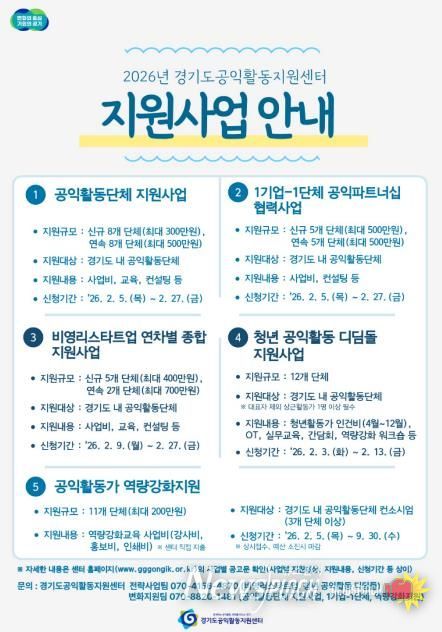 유명화 경기도공익활동지원센터장은 “이번 모집을 통해 공익활동의 현장 기반을 강화하고, 다양한 주체들이 지역사회 문제 해결에 적극 참여하길 기대한다”고 말했다.
