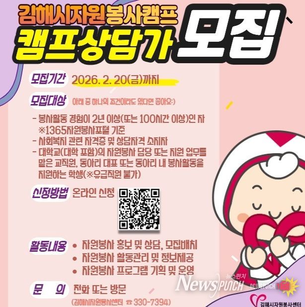 뉴스펀치 박세훈 기자 | 김해시자원봉사센터는 관내 자원봉사캠프 7개소(행정복지센터 6, 문화의집 1)에서 활동할 열정 가득한 신규 캠프상담가를 모집한다고 5일 밝혔다.