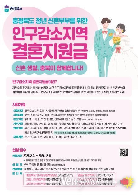 뉴스펀치 이현승 기자 | 충북 괴산군은 청년들의 결혼 초기 경제적 부담을 덜고 안정적인 지역 정착을 돕기 위해 ‘2026년 인구감소지역 결혼지원금 사업’을 본격 추진한다고 5일 밝혔다.