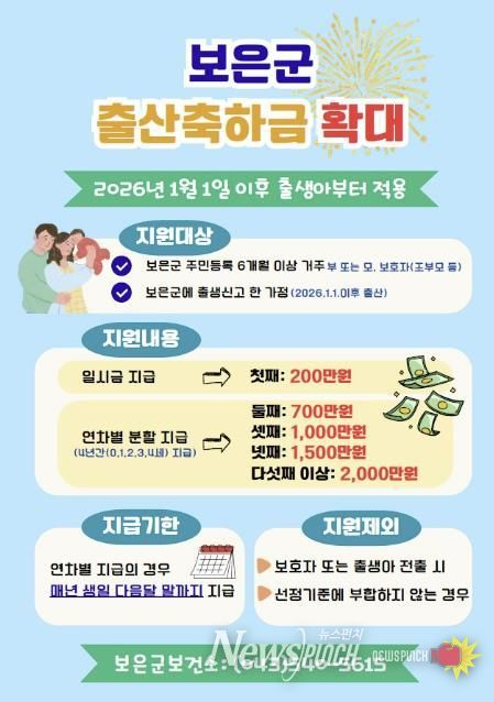 뉴스펀치 이현승 기자 | 충북 보은군은 저출생 극복과 출산·양육 가정의 경제적 부담 완화를 위해 2026년부터 출산축하금 지원을 확대 시행한다고 밝혔다.