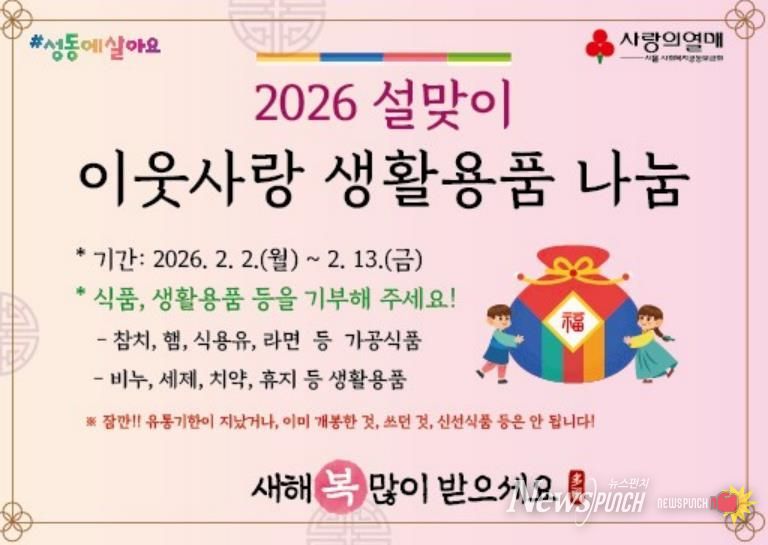 뉴스펀치 박상훈 기자 | 서울 성동구는 다가오는 설 명절을 맞아 누구도 소외되지 않는 따뜻한 명절을 만들기 위해 오는 2월 13일까지 생활용품과 식료품을 기부하는 '2026 설맞이 이웃사랑 생활용품 나눔 사업'을 추진한다.