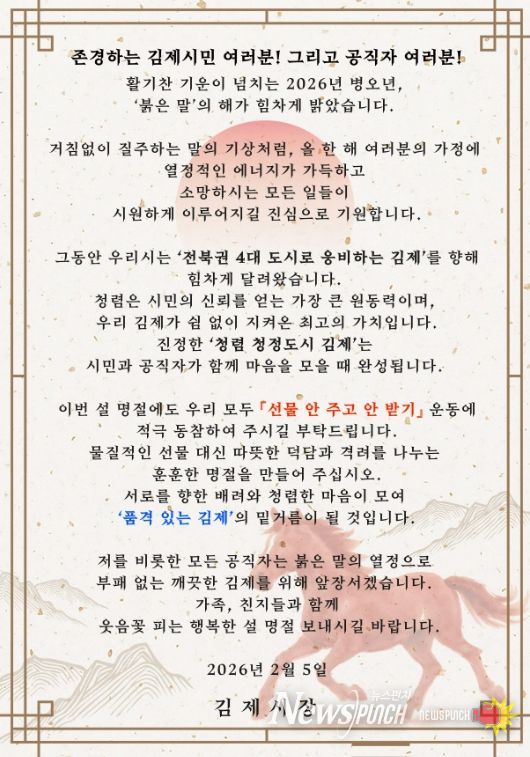 이번 청렴 주의보는 부패 취약 시기인 설 명절을 전후로 5일부터 오는 18일까지 발령되며, 공직사회 전반에 깨끗하고 투명한 청렴 의식을 고취하고 시민과 함께하는 투명하고 깨끗한 김제를 구현하기 위해 추진된다.