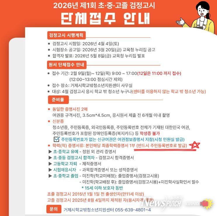 뉴스펀치 박세훈 기자 | 거제시학교밖청소년지원센터는'2026년 제1회 초・중・고 졸업학력 검정고시'응시자를 위해 2월 9일 09:00부터 12일 17:00까지 학교 밖 청소년을 대상으로 단체 원서 접수를 지원한다고 밝혔다.