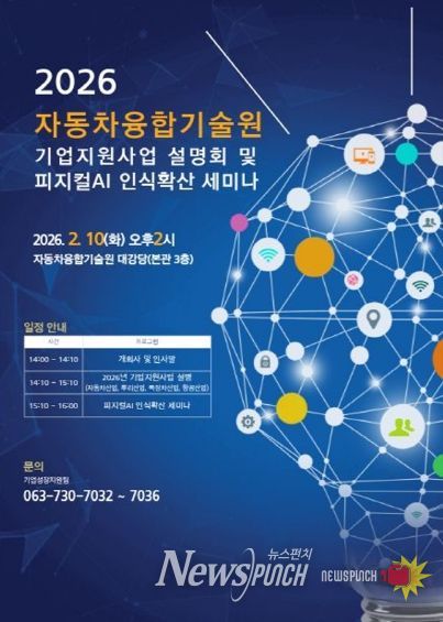 뉴스펀치 최영남 기자 | 전북특별자치도는 도내 자동차·뿌리·특장·항공산업 등 주력산업의 경쟁력 강화를 위해 오는 10일 자동차융합기술원에서 ‘2026년 기업지원사업 설명회 및 피지컬AI 산업 인식확산 세미나’를 개최한다고 5일 밝혔다.