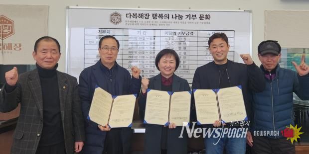 뉴스펀치 박상훈 기자 | 파주시 교하동은 지난 4일, 김택철 교하동 지역사회보장협의체 위원장, 이근복 교하동 노인회 분회장, 이만형 문발리 경로당 노인회장이 참석한 가운데 문발동에 위치한 다복해장에서 이웃사랑 실천을 위한 ‘교하사랑나눔가게’협약을 체결했다.