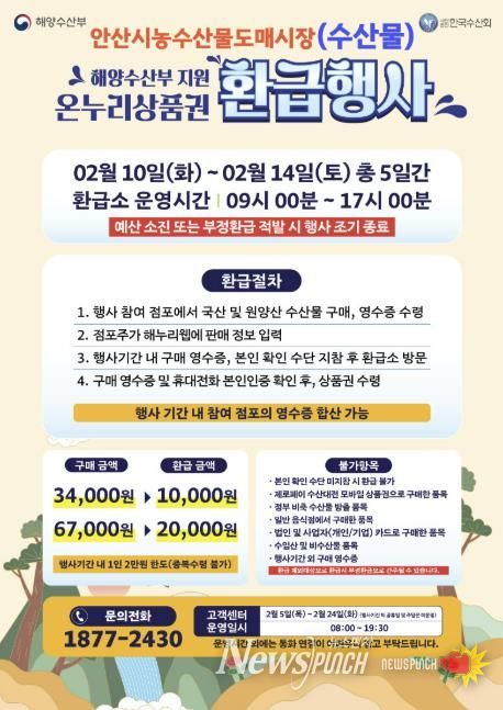 뉴스펀치 박상훈 기자 | 안산시는 설 명절을 맞아 국산 수산물 소비 촉진과 도매시장 활성화를 위해 오는 10일부터 14일까지 5일간 ‘2026년 설 온누리상품권 환급행사’를 개최한다고 5일 밝혔다.