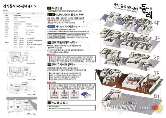 첫째, 산청읍 옥산리 163-1번지 일원에 총116억원을 투입, 지하1층 지상4층 규모로 편안한 둘레 체류공간을 위해 문화융복합 체류형 거점인 산청둘레 365센터가 조성되며, 거점연계 공간을 위해 리셉션광장과 공가를 활용한 레지던스 숙박시설을 조성하여 우리군을 찾는 관광객이 머물수 있는 공간으로 활용할 예정이다.