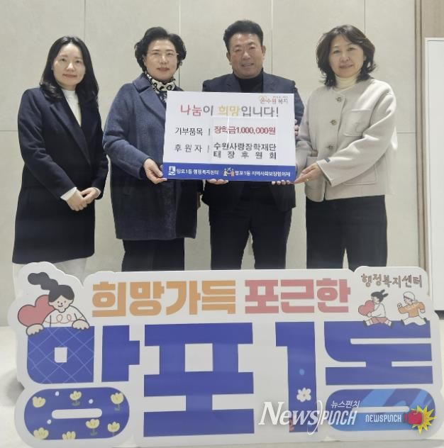 뉴스펀치 박상훈 기자 | 수원시 영통구 망포1동은 지난 4일, 수원사랑장학재단 태장후원회에서 민족 고유 명절 설을 맞아 지역인재 육성과 이웃사랑 실천을 위해 장학금 100만원을 기탁했다고 밝혔다.