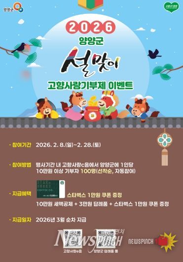 뉴스펀치 조평훈 기자 | 양양군이 2026년 설 명절을 맞아 고향사랑기부제 참여 확산을 위해 '붉은 말의 해! 고향사랑기부제 설맞이 이벤트'를 실시한다.