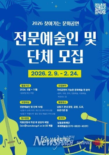 뉴스펀치 정홍균 기자 | 인천시 남동구 남동문화재단은 지역 곳곳을 무대로 펼쳐지는 ‘2026 찾아가는 문화공연’에 참여할 공연 전문예술인 및 단체를 오는 9~24일까지 공개 모집한다고 5일 밝혔다.