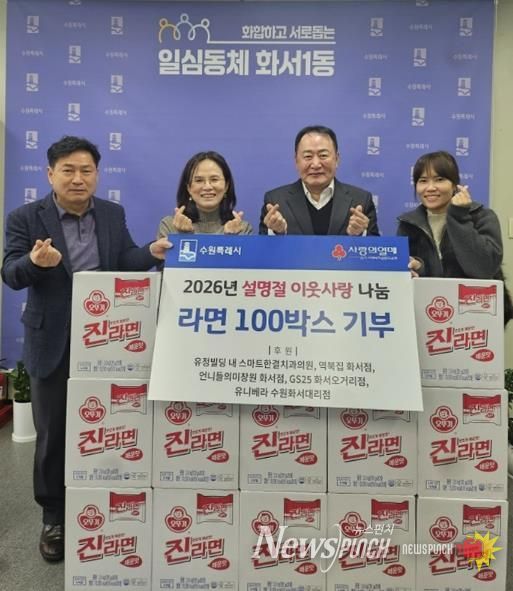 이번 기부는 유정빌딩 입주상가인 ▲스마트한결치과의원 ▲역북집 화서점 ▲언니들의 미장원 화서점 ▲GS25 화서오거리점 ▲유니베라 수원화서대리점이 지역 내 어려운 이웃을 돕기를 위해 뜻을 모아 마련했으며, 기부된 라면 100박스는 화서1동 행정복지센터를 통해 관내 저소득층 및 취약계층 가구에 전달될 예정으로, 설 명절을 앞두고 따뜻한 나눔의 의미를 더했다.