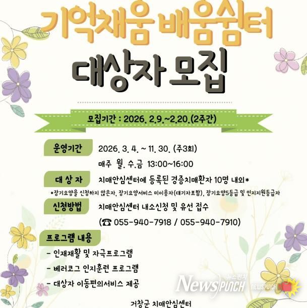 뉴스펀치 박세훈 기자 | 거창군치매안심센터는 오는 9일부터 20일까지 경증 치매 환자 중 전문적 인지자극 프로그램과 돌봄을 제공하는 ‘기억채움 배움쉼터’에 참여할 대상자를 모집한다.