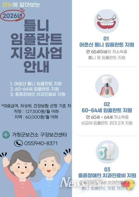 뉴스펀치 박세훈 기자 | 거창군 보건소는 오는 9일부터 27일까지 치아 상실로 식사와 일상생활에 불편을 겪고 있는 저소득층을 대상으로 틀니, 임플란트 지원사업 신청을 받는다.