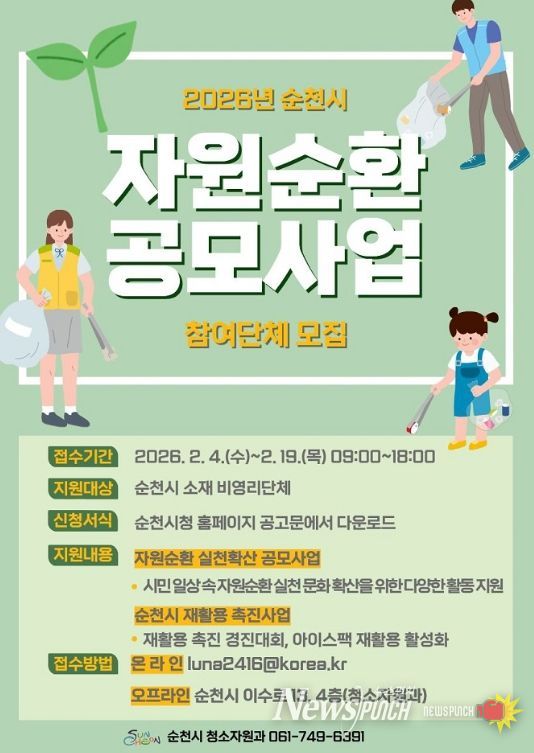 뉴스펀치 조평훈 기자 | 순천시는 시민의 일상 속 자원순환 문화 확산과 재활용 실천 활성화를 위해 2026년 자원순환 공모사업 참여 단체를 모집한다고 밝혔다.