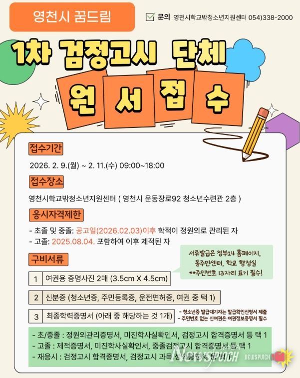 뉴스펀치 박세훈 기자 | 영천시학교밖청소년지원센터는 학교 밖 청소년의 학력 취득을 지원하기 위해, 오는 4월 4일 실시 예정인 2026년 제1회 초·중·고등학교 졸업학력 검정고시와 관련해 원서접수 대행 서비스를 9일부터 11일까지 운영한다고 밝혔다.