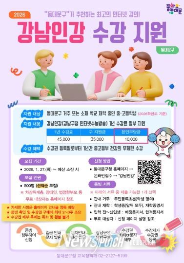 뉴스펀치 박상훈 기자 | 서울 동대문구는 관내 중·고등학생의 사교육비 부담을 덜고 자기주도 학습 기반을 넓히기 위해 ‘강남인강(강남구청 인터넷수능방송) 수강 지원 사업’을 2026년에도 이어간다고 밝혔다.