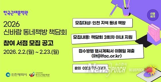 뉴스펀치 정홍균 기자 | 인천문화재단 한국근대문학관은 인천 지역 동네책방과 함께하는 2026년 '신바람 동네책방 책담회' 참여서점을 모집한다.