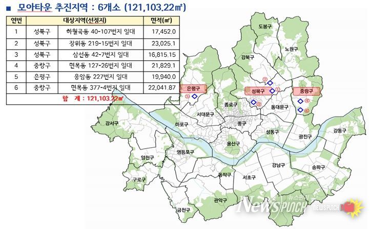 서울시는 2월 4일 제2차 도시계획위원회에서 주민제안 모아타운 신규 신청지역 6곳(성북구 3곳, 중랑구 2곳, 은평구 1곳)의 지목 도로를 토지거래허가구역으로 신규 지정했다고 밝혔다. 지정기간은 2월 17일부터 2031년 2월 16일까지 5년간이다.