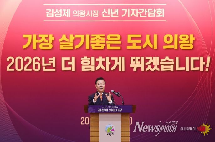 뉴스펀치 박상훈 기자 | 김성제 의왕시장이 5일 시청 대회의실에서 2026년 신년 기자간담회를 열고 민선8기 의왕시 주요성과와 2026년 시정 운영방향에 대해 설명하는 시간을 가졌다.