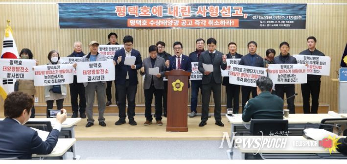 뉴스펀치 박상훈 기자 | 경기도의회 이학수 의원(국민의힘, 평택5)은 5일(목) 경기도의회 기자회견장에서 기자회견을 열고 한국농어촌공사가 발표한 평택호 수상태양광 사업 공고의 즉각적인 취소를 강력히 요구했다.