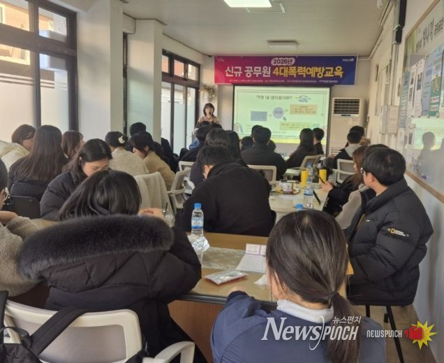 뉴스펀치 박세훈 기자 | 포항시는 이달 3일과 5일 두 차례에 걸쳐 대흥동 성매매 집결지 내 공유공간인 ‘현장시청 빛나길 센터’에서 2026년 신규공무원 56명을 대상으로 ‘4대폭력(성희롱·성폭력·성매매·가정폭력) 예방교육’을 실시했다.