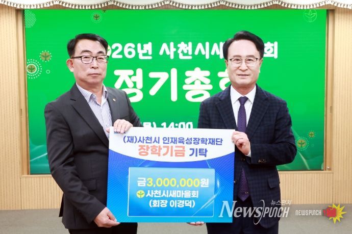 뉴스펀치 박세훈 기자 | 사천시새마을회(회장 이경덕)는 5일 지역사회의 미래를 이끌어갈 인재 양성을 위해 사용해 달라며 사천시 인재육성장학재단(이사장 박동식)에 장학금 300만 원을 기탁했다.