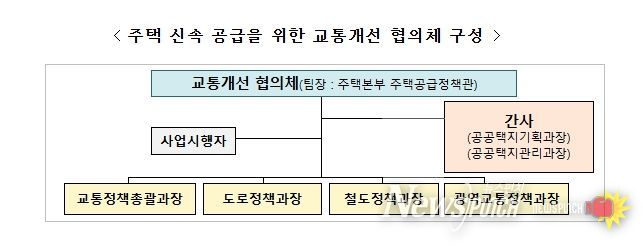 협의체는 주택공급추진본부 주택공급정책관을 팀장으로 교통정책총괄과장, 도로정책과장, 철도정책과장, 광역교통정책과장으로 구성되며, 주택공급 대상지와 관련하여 도로·철도·대중교통 등 교통 전반에 관련한 개선방안을 종합적으로 검토할 계획이다.