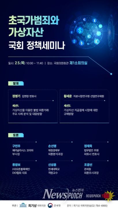 뉴스펀치 정홍균 기자 | 관세청은 최기상 국회의원(더불어민주당·서울 금천구)과 공동으로 2월 5일 국회 의원회관에서 '초국가범죄와 가상자산: 국경을 넘어선 불법 자금 흐름 대응' 국회 정책 세미나를 개최했다.