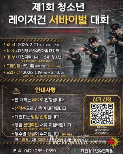 뉴스펀치 이현승 기자 | 대전청소년수련마을은 지역 청소년의 건강한 여가문화 조성과 협동심 함양을 위해 ‘제1회 레이저건 서바이벌 대회’를 21일 개최한다.