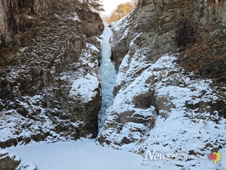 뉴스펀치 이현승 기자 | 2월의 한겨울, 충북 영동군 심천면에 위치한 옥계폭포가 빙벽과 어우러진 웅장한 겨울 풍경으로 방문객들의 시선을 사로잡고 있다.
