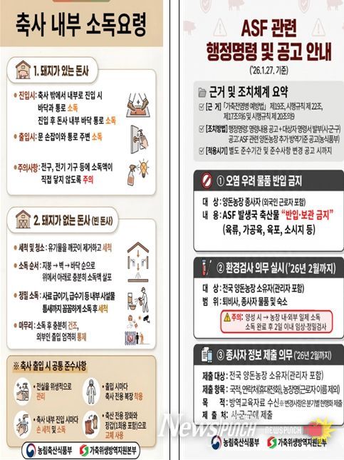 안재완 강원특별자치도 동물방역과장은 “최근 아프리카돼지열병은 특정 지역이나 계절에 국한되지 않고 전국적으로 산발적 발생 양상을 보이고 있다”며 “강화된 행정명령과 공고사항은 선택이 아닌 의무사항이라는 인식 아래 철저히 이행해 주길 바란다”고 강조했다.