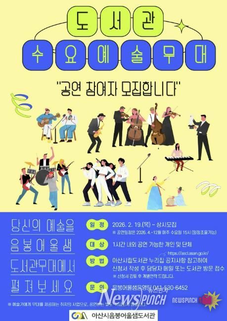 뉴스펀치 이현승 기자 | 아산시는 시민과 함께 즐길 수 있는 다양한 공연 활동을 도서관 공간에서 선보이는 ‘도서관 수요예술무대’를 운영하고, 2026년 프로그램에 참여할 예술인과 단체를 상시 모집한다고 밝혔다.