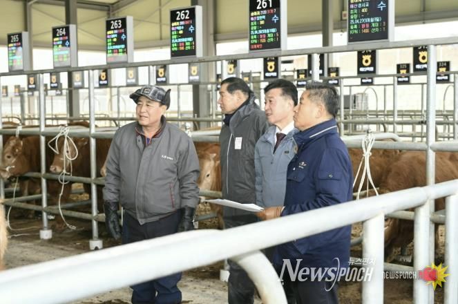뉴스펀치 이현승 기자 | 최재구 예산군수는 2월 5일 오전 9시 오가면 국사봉로 440에 위치한 예산군 가축경매시장을 방문해 경매 운영실태를 점검하고 축산농가들을 격려했다.