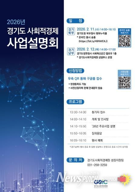 뉴스펀치 박상훈 기자 | 경기도사회적경제원은 오는 11일과 12일 양일간 경기 북부와 남부에서 ‘2026년 경기도 사회적경제 사업설명회’를 연다.