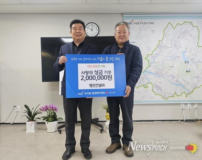 뉴스펀치 박상훈 기자 | 파주시 조리읍은 지난 3일, 영진건설㈜과 천연건설㈜로부터 각각 200만 원씩, 총 400만 원의 이웃 돕기 성금을 전달받았다고 밝혔다.