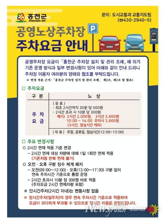 뉴스펀치 조평훈 기자 | 홍천군은 공영 노상주차장 주차 관제시스템을 새롭게 도입하고, 2026년 2월부터 공영 노상주차장의 주차 요금 ‘부과 시간 산정 방식’을 변경해 시행한다고 밝혔다.