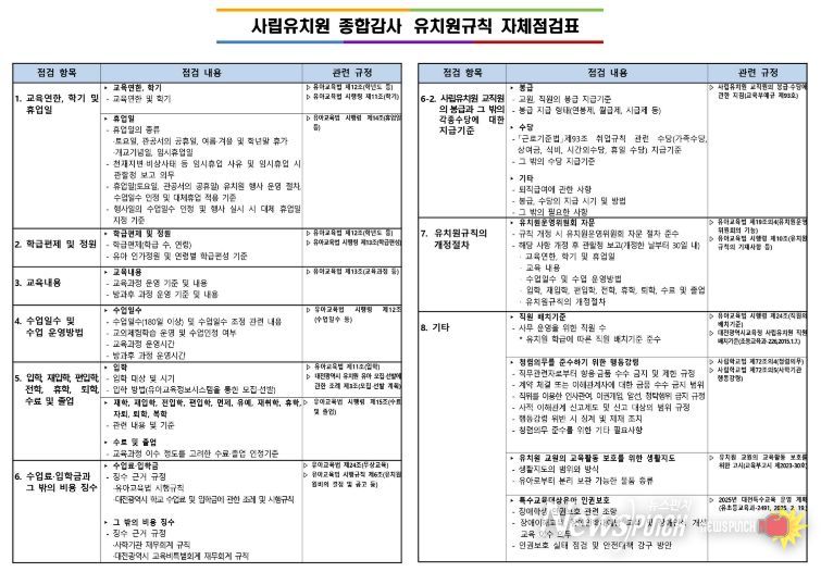 운영지원과 장미영 과장은 “유치원규칙에 대한 자체점검 기능을 강화하는 것은 청렴한 유치원 운영의 출발점”이라며, “앞으로도 예방 중심의 감사문화 정착을 통해 사립유치원의 자율성과 책임성을 높일 수 있도록 지속적으로 지원해 나가겠다”라고 밝혔다.