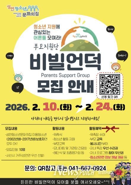 뉴스펀치 이현승 기자 | 성연청소년문화의집은 2026년 한 해 동안 지역 청소년의 건강한 성장과 안정적인 발달을 지원하기 위해, 청소년 보호자를 대상으로 부모지원단 ‘비빌언덕’ 참여자를 2월 10일부터 2월 24일까지 모집한다고 밝혔다.