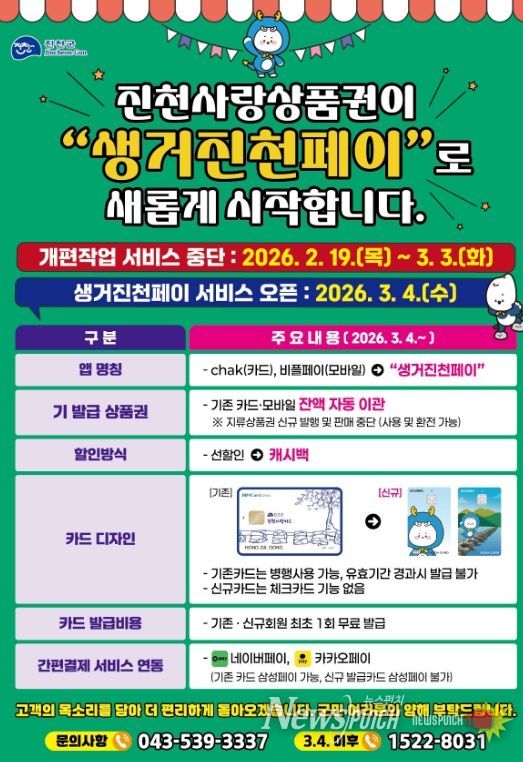 뉴스펀치 이현승 기자 | 충북 진천군은 진천사랑상품권 시스템을 전면 개편해 ‘생거진천페이’로 오는 3월 4일부터 서비스를 재개한다고 6일 밝혔다.