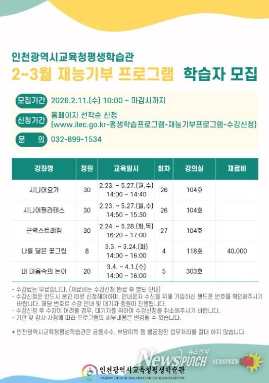 뉴스펀치 정홍균 기자 | 인천광역시교육청평생학습관은 오는 23일부터 ‘재능기부 프로그램’을 운영한다.
