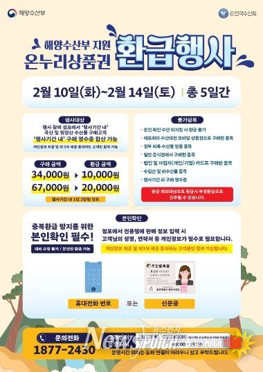 뉴스펀치 박세훈 기자 | 해양수산부가 주최하는 ‘수산물 온누리상품권 환급 행사’가 오는 2월 10일부터 14일까지 5일간 영덕전통시장 및 강구시장에서 진행된다.