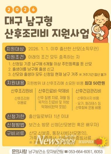 뉴스펀치 조평훈 기자 | 대구 남구는 저출생 대응과 출산가정의 실질적인 부담 완화를 위해 2025년부터 대구 최초로 시행 중인 ‘대구 남구형 산후조리비 지원사업’의 지원을 확대한다고 밝혔다.