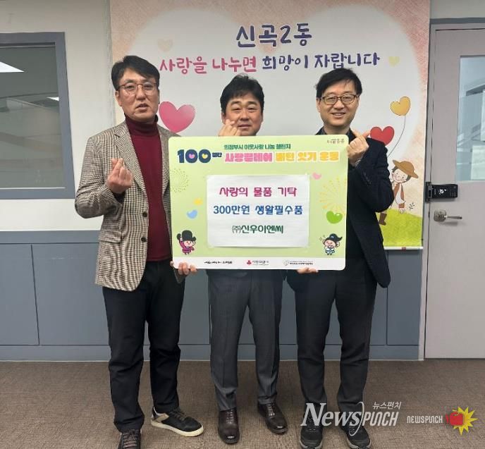 뉴스펀치 박상훈 기자 | 의정부시 신곡2동주민센터는 2월 3일 ㈜신우이엔씨가 총 300만 원 상당의 생활필수품(세탁세제‧샴푸‧비누 등)을 기탁하며 ‘100일간 사랑릴레이 배턴 잇기’에 동참했다고 밝혔다.