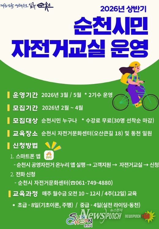 뉴스펀치 김용희 기자 | 순천시는 자전거 이용 활성화와 안전한 교통문화 정착을 위해 2026년 상반기 시민 자전거교실 수강생을 모집한다고 밝혔다.