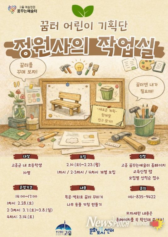 뉴스펀치 김용희 기자 | 고흥군은 오는 2월 10일부터 23일까지 꿈터 어린이 기획단 '정원사의 작업실'에 참여할 지역 내 초등학생 10명을 선착순으로 모집한다고 밝혔다.