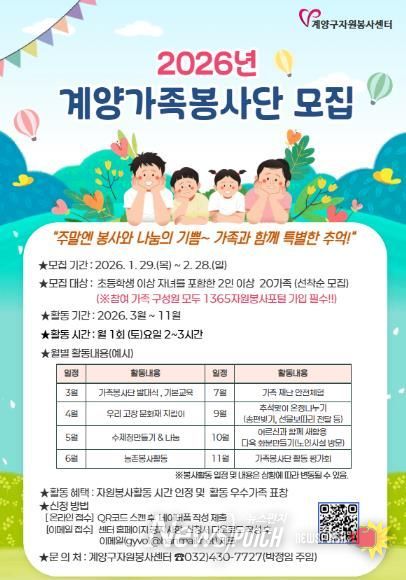 뉴스펀치 정홍균 기자 | 인천광역시 계양구 자원봉사센터는 가족 단위 자원봉사 문화 확산을 위해 2026 마음 잇는 ‘계양 가족봉사단’에 참여할 20가족을 오는 3월 2일까지 선착순 모집한다고 밝혔다.